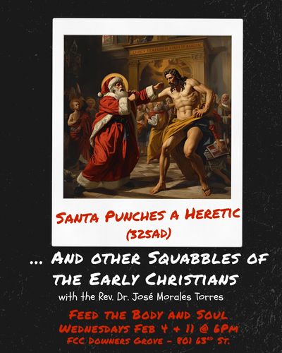 For two weeks we have a special study by theologian Dr, Jose Morales Torres , who will present a fascinating study on the early Christians: "Santa Punches A Heretic and Other Squabbles of the Early Christians. " Join Us!